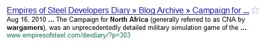 While researching some stuff on WW2 North Africa, I stumbled on an elaborate boardgame called “The campaign for North Africa”. I thought it was interesting, so I added a short blog-post on the empires of steel website. Then, I continued doing google searches about North Africa. Literally, within ten minutes of adding that blog-post, I noticed my own blog post come up in the search results — in less than ten minutes! Wow.
